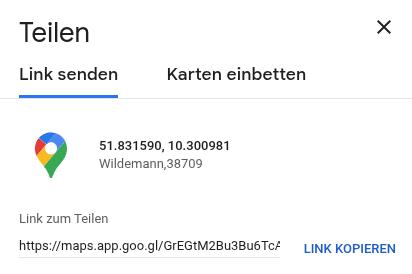 Nach Klick in die google maps Karte öffnet sich am unteren Rand ein modaler Rahmen. Nach Klick auf das „Link-Icon“ rechts im Rahmen öffnet sich ein neuer modaler Rahmen: